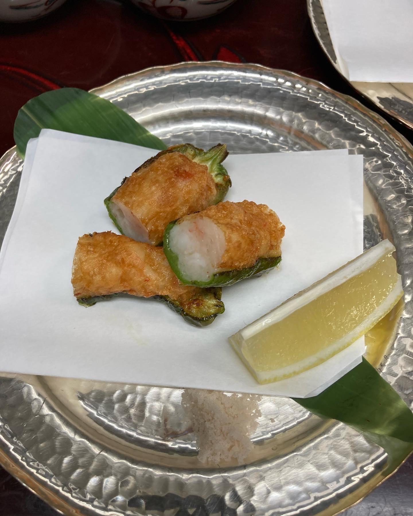 万願寺唐辛子に海老真薯を塗った揚げ物です。